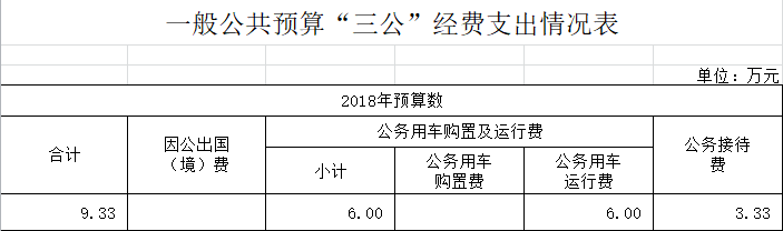 2018年“三公”经费预算9.33万元,与2017年持平。其中:因公出国(境)费用0万元,与2017年持平;公务接待费3.33万元,较2017年无变化;公务用车运行维护费6万元,较2017年无变化;公务用车购置费0万元,与2017年持平。