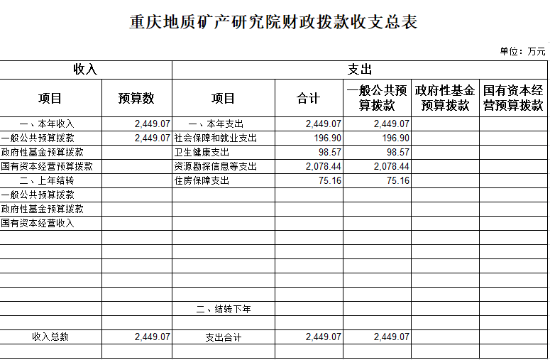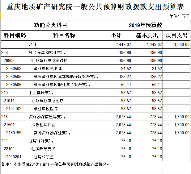 2019年一般公共预算财政拨款收入2,449.07万元,一般公共预算财政拨款支出2,449.07万元,比2018年减少119.20万元。其中:基本支出1,149.07万元,与2018年相比减少119.20万元,主要原因是2019年预算取消了不应纳入岗位津贴的支出。主要用于保障我院在职人员工资福利及社会保险缴费,保障部门正常运转的各项商品服务支出。项目支出1,300.00万元,与2018年保持一致。主要用于保障我院科技基础平台运行、非常规天然气勘探开发技术支撑经费和实验仪器设备购置等重点工作。